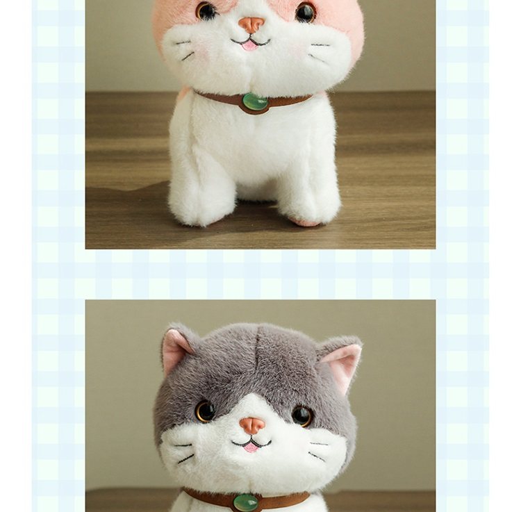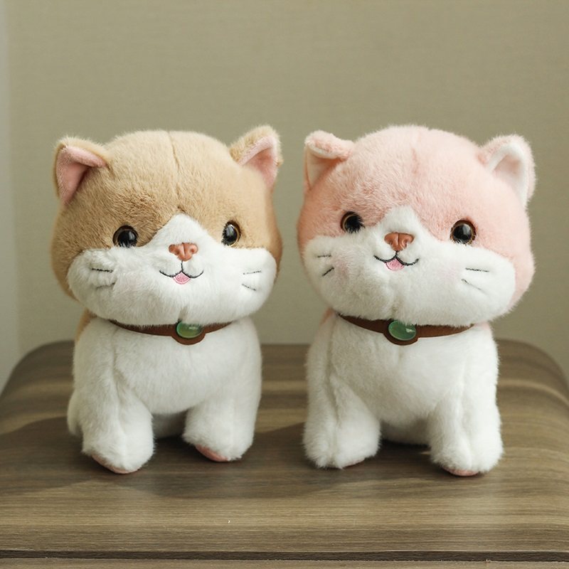 まん丸なお顔とぷっくりしたほっぺが愛らしい猫ぬいぐるみです。 白のふわふわとした柔らかな素材で作られており、触り心地は抜群です。 つぶらな瞳と小さな舌を出した笑顔の表情が可愛らしく、首元には緑の飾りが付いた茶色の首輪がアクセントになっています。 お座りした姿勢で安定感があり、お部屋のインテリアや癒しのパートナーとして最適です。 子猫の愛くるしさを再現した、心温まる一品です。