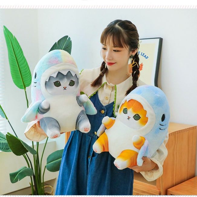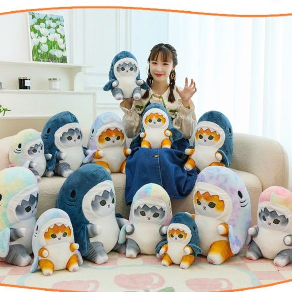 愛らしい子猫がサメの着ぐるみをかぶった、ユニークで可愛らしいグレーの猫ぬいぐるみです。