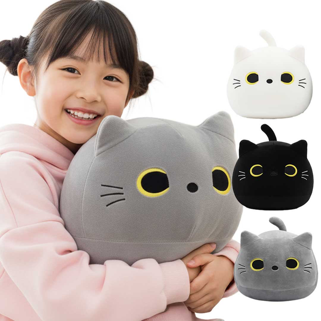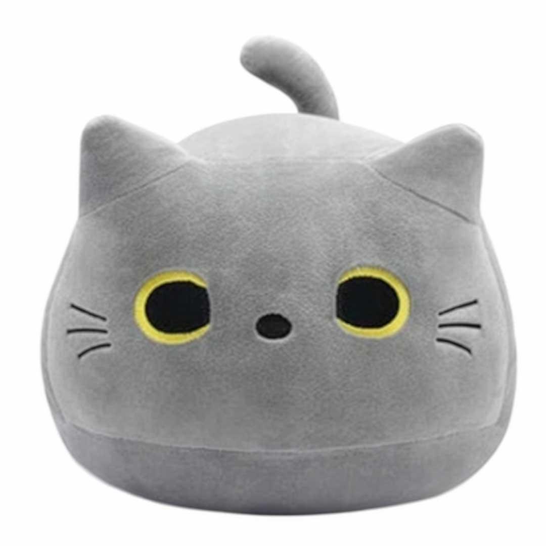 丸いフォルムがたまらない、グレーカラーの猫ぬいぐるみクッションです。