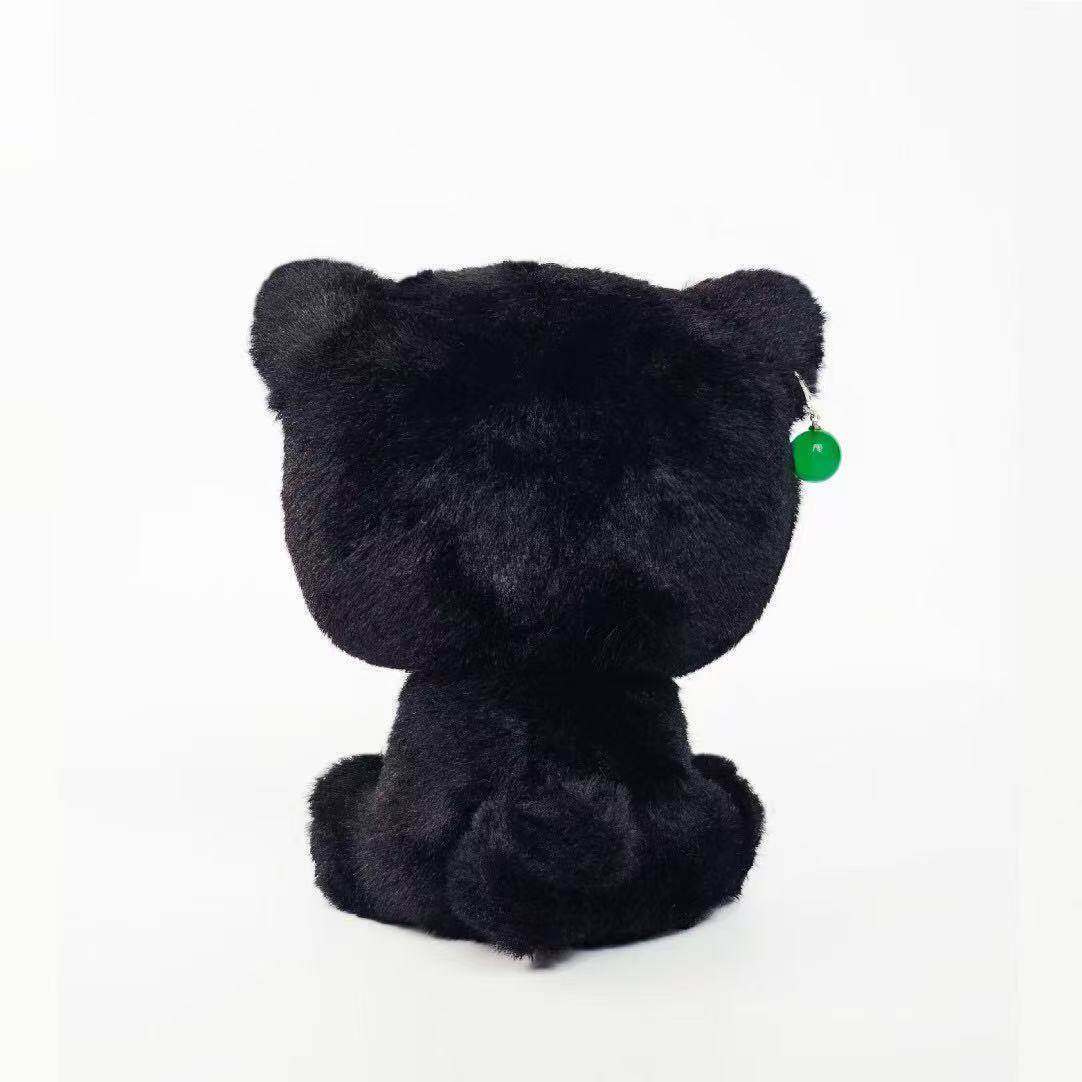 美しい緑の宝石イヤリングが印象的な黒の猫ぬいぐるみです。